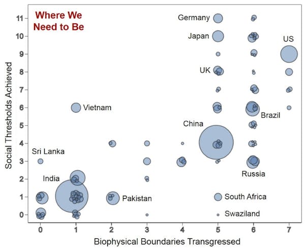 Aunque las naciones ricas como los Estados Unidos y el Reino Unido satisfacen las necesidades básicas de sus ciudadanos, lo hacen a un nivel de uso de recursos que va mucho más allá de lo que es globalmente sostenible. Por el contrario, los países que utilizan recursos a un nivel sostenible, como Sri Lanka, no satisfacen las necesidades básicas de sus pueblos. Es preocupante que cuanto más umbrales sociales alcanza un país, más límites biofísicos tiende a transgredir.
