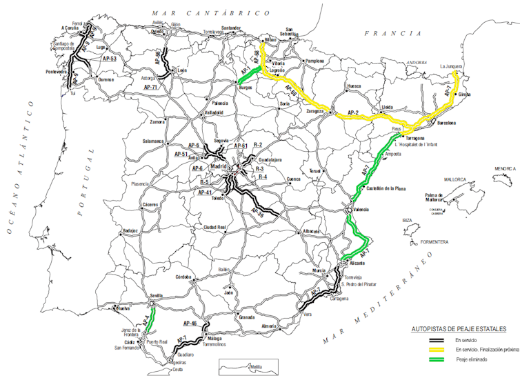 Según el Ministerio de Fomento, la red de carreteras del Estado tiene 17 228 km de vías de gran capacidad. Casi el 19%, 3 223 km, son actualmente de peaje. Tras la finalización de las concesiones de este año y del próximo quedarán poco más de 2 000 km de vías de peaje, que representarán el 11% del total. La mayor parte, por tanto, se financian con cargo a los Presupuestos del Estado.