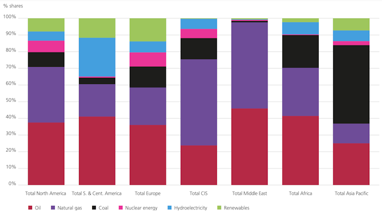 En las regiones cuyo consumo energético está creciendo más (léase Asia-Pacífico), los fósiles aportan más del 85 % de su consumo. Abandonar el carbón es más sencillo en América o Europa, pero no tanto en Asia o África.