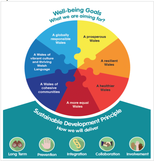 Desde 2015, la Ley de Bienestar de las Generaciones Futuras de Gales requiere que todos los organismos públicos coloquen siete objetivos de bienestar, informados por un proceso de consulta pública a gran escala, en el centro de su toma de decisiones . Estos siete objetivos son: un Gales próspero, un Gales resistente, un Gales más equitativo, un Gales más saludable, un Gales de comunidades cohesionadas, un Gales de cultura vibrante y un idioma galés próspero, y un Gales globalmente responsable. Cada año, el gobierno de Gales evalúa el progreso en relación con estos siete objetivos, en función de un conjunto de 50 indicadores nacionales.
