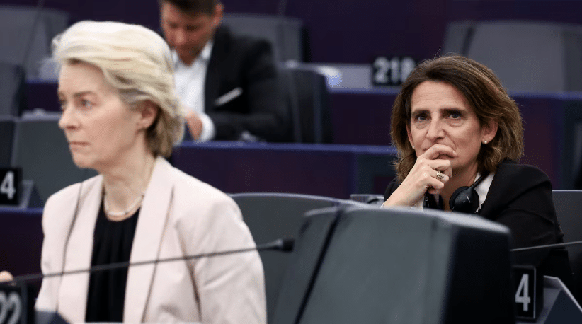 En primer plano, la presidenta de la Comisión Europea, Ursula von der Leyen, y, detrás, la vicepresidenta de Transición Ecológica, Teresa Ribera.Yves Herman (REUTERS)