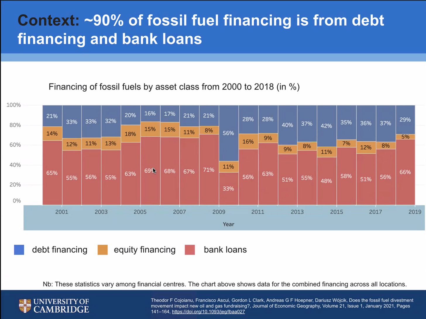 - La capacidad de los sectores bancarios para prestar (crear dinero) para proyectos de combustibles fósiles “rentable” está limitada solo por consideraciones de maximización de beneficios y regulación. Esta es una de las razones por las que los bancos son los mayores prestamistas de los combustibles fósiles y *toda* la inversión primaria en inversión de capital en todos los países. No tienen que primero recaudar capital antes de poder prestar.