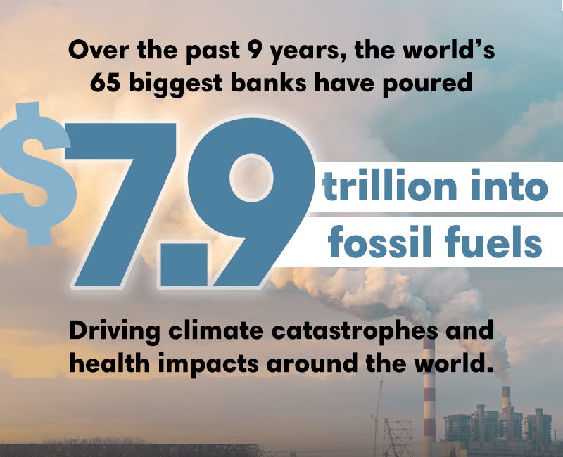 No sólo los bancos son los mayores financiadores de los combustibles fósiles, sino que la cantidad de financiación que proporcionan al sector de los combustibles fósiles es masiva. El informe de 2025 Banking on Climate Chaos muestra que los bancos han proporcionado préstamos, suscripción y líneas de crédito por un valor de 7.9 billones de dólares a las compañías de combustibles fósiles, a nivel mundial. Para poner eso en perspectiva, si usted gastara 1 millón de dólares cada día durante los próximos 21.000 años, no llegarías a gastar esos 7.9 billones.