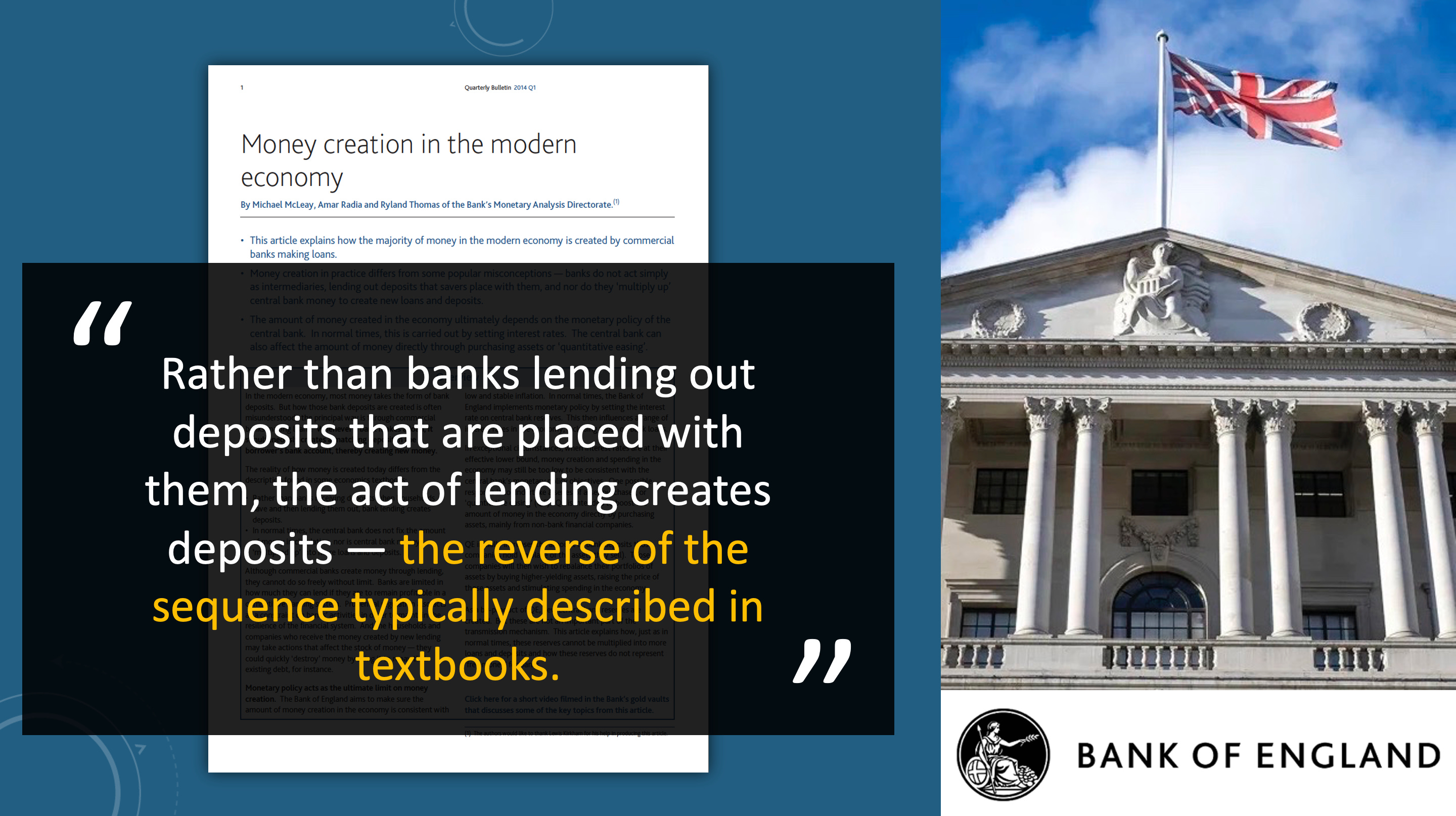 La mayoría de la gente no sabe que los bancos crean el 100% del dinero que prestan. Contrariamente a la creencia popular y las narrativas convencionales, los bancos no prestan depósitos. Cada vez que los bancos prestan, crean los depósitos que recibe el prestatario. El Banco de Inglaterra lo explica de esta manera en su boletín fundamental Money Creation in the Modern Economy: