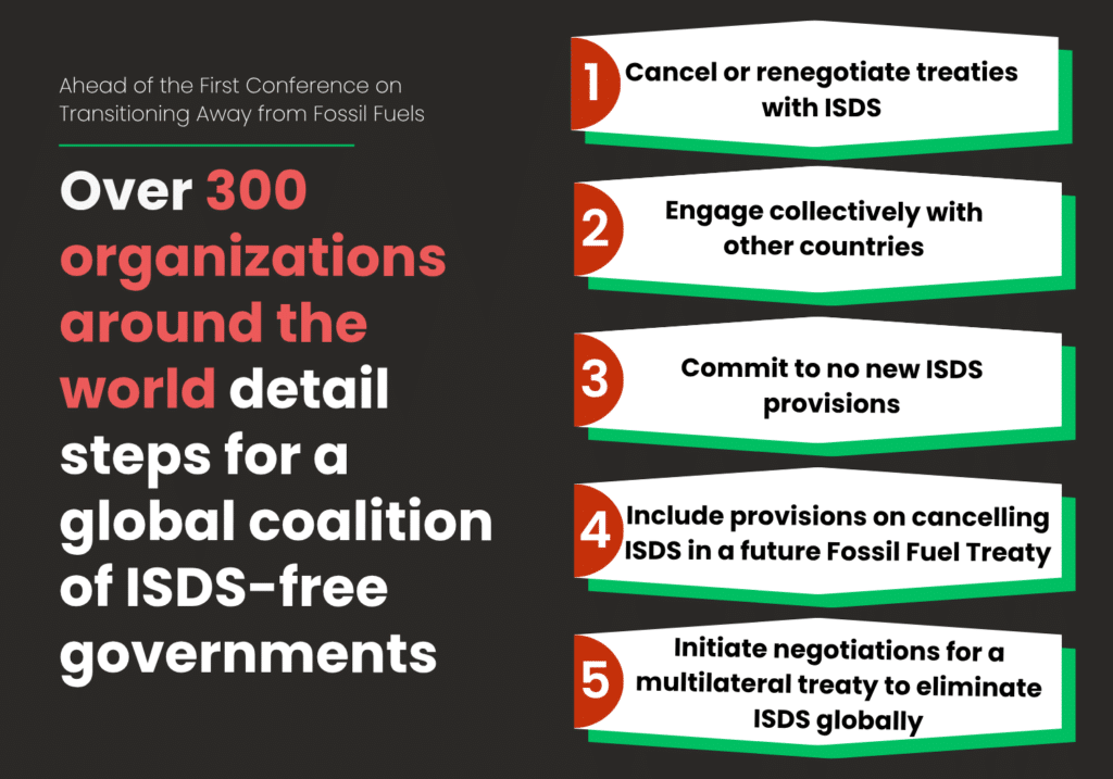 El sistema de disputa entre inversor y Estado (ISDS, por sus siglas en inglés) está amenazando una transición sostenible y justa lejos de combustibles fósiles y la urgente necesidad de una transformación ecológica y social para las personas y el planeta. Reconocemos la inclusión de este riesgo en los pilares temáticos de la primera Conferencia sobre Transición para Alejarse de los Combustibles Fósiles.