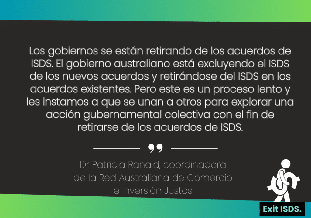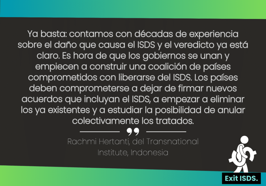 El ISDS es una amenaza para nuestro futuro. Instamos a los gobiernos de todo el mundo a construir una coalición para liberarse de este sistema internacional de tribunales opacos.