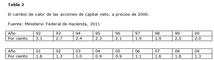 La Tabla 2 muestra el cambio del valor del stock de capital neto en Alemania como ejemplo de una economía madura cerca del punto de estancamiento, siempre y cuando no se den cambios significativos en la fuerza de trabajo. Es fácil ver que la tasa de crecimiento del stock de capital de la economía alemana está, en efecto, en el rango en el que Keynes asume para la prima de liquidez.